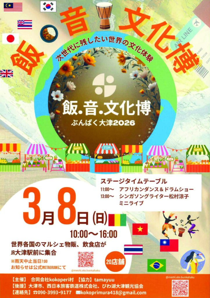 世界各国のおいしい食べ物、素敵な雑貨、アフリカンダンス&太鼓ステージ、シンガソングライターのステージなど、東南アジアのマーケットみたいな体験。大津駅前で海外旅行気分をお楽しみください。