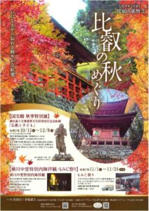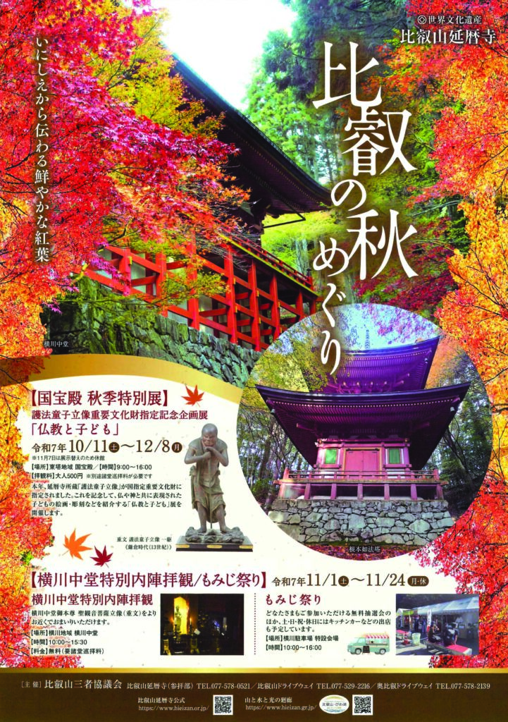 比叡山の秋の訪れは早く、例年10月下旬から見頃を迎えます。比叡山の紅葉の中でも最も見事と言われる横川では「横川中堂特別内陣拝観」や「もみじ祭り」が開催されます。