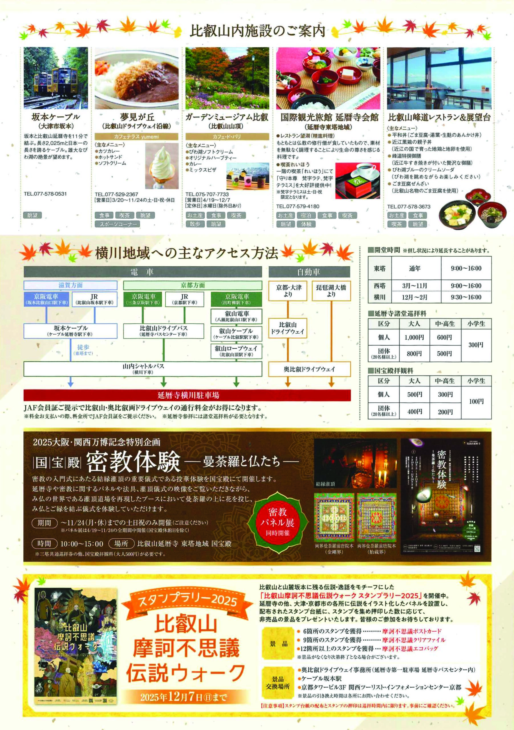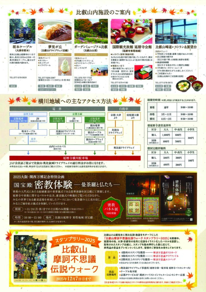 ・比叡山延暦寺(077-578-0521) ・比叡山ドライブウェイ(077-529-2216) ・奥比叡ドライブウェイ(077-578-2139) |