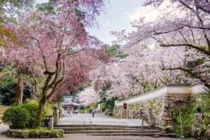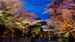 万葉の時代から桜の名所として親しまれてきた三井寺。境内に咲き乱れる千本を超えるソメイヨシノや山桜、しだれ桜が鮮やかにライトアップされ、ことに参道沿いの桜並木は圧巻。幻想的な夜桜の世界が広がります。