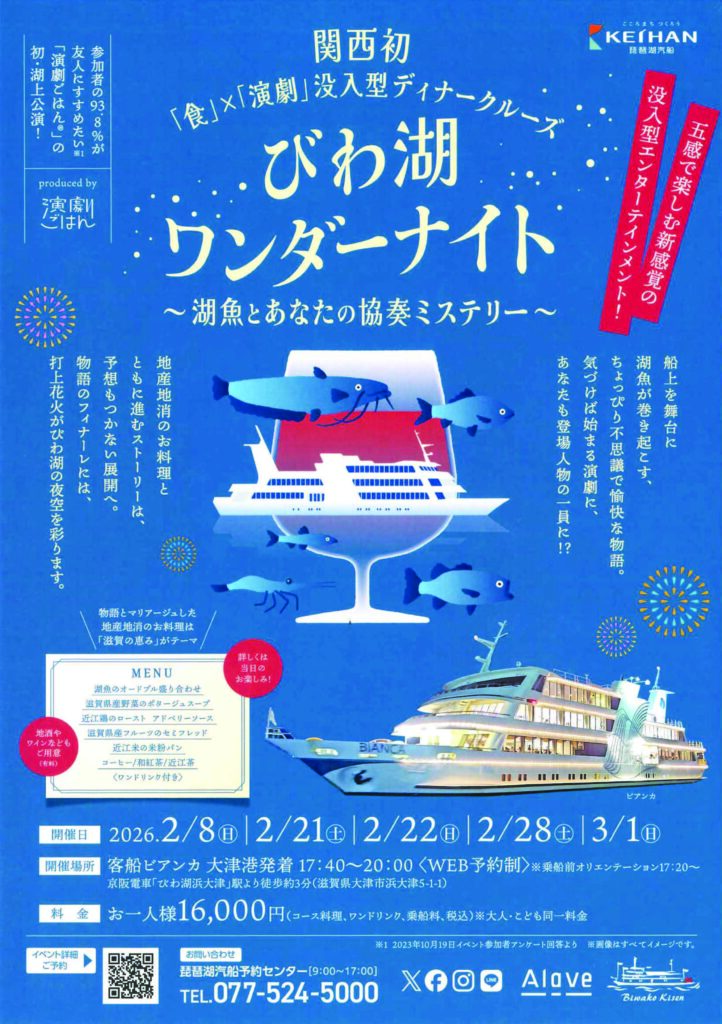 びわ湖最大級の大型客船「ビアンカ」を舞台に、お客様自身が物語の登場人物となって、ユーモラスな演劇の世界へと引き込まれる没入型のディナークルーズ「びわ湖ワンダーナイト~湖魚とあなたの協奏ミステリー~」が、大津港発着にて運航されます!