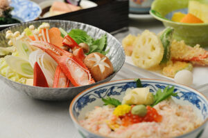 蟹と鶏団子の小鍋や蟹ちらし寿司など、高層階からの絶景と冬ならではのホテルグルメをお楽しみください。