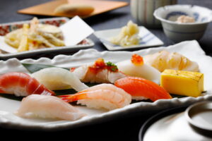 冬に脂がのって旨みが増す「寒鰤」や「金目鯛」をはじめ、とろけるような「鮪」、身のしまった「滋賀県産大鱒」など、色鮮やかな海鮮を職人技が光る握りでご用意。揚げたての天麩羅や温かい茶碗蒸しとともにお楽しみください。