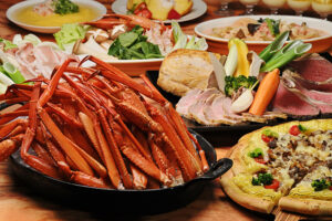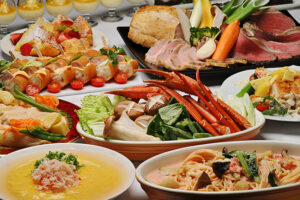 ボイル蟹の食べ放題や蟹と野菜の白湯鍋、滋賀の郷土料理「じゅんじゅん」など、冬ならではの味覚が揃うディナーブッフェ。低温で仕上げたローストビーフとローストポークに加え、タイムサービスにてご提供する近江牛のしぐれ煮とポテトの和風ピザなど、和洋中の多彩なメニューをお楽しみください。