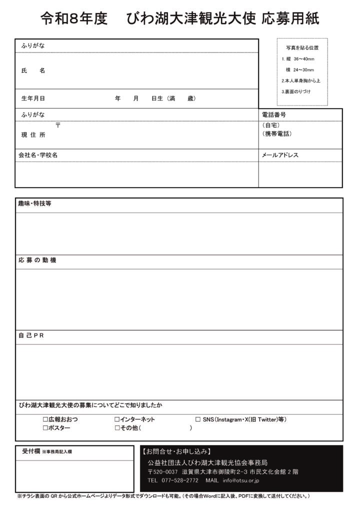 所定の応募用紙に該当事項を記入し、所定の場所に写真を1枚添付し、びわ湖大津観光協会へ提出してください(メール・郵送可)