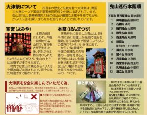 【山建て】10月5日(日)8時30分~15時【宵宮】10月11日(土)夕刻~21時【本祭】10月12日(日)9時~17時30分 |