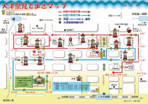 大津駅前の賑やかな雰囲気の中、曳山が通り過ぎる様子を臨場感あふれる場所で観覧できます。