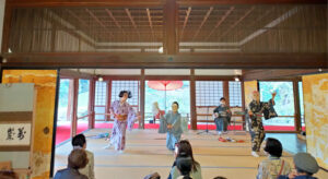 大津絵から着想を得たユニークな踊りを、皇室ゆかりの圓満院門跡 宸殿にて鑑賞。また、併設の美術館で本物の大津絵作品を見学します。