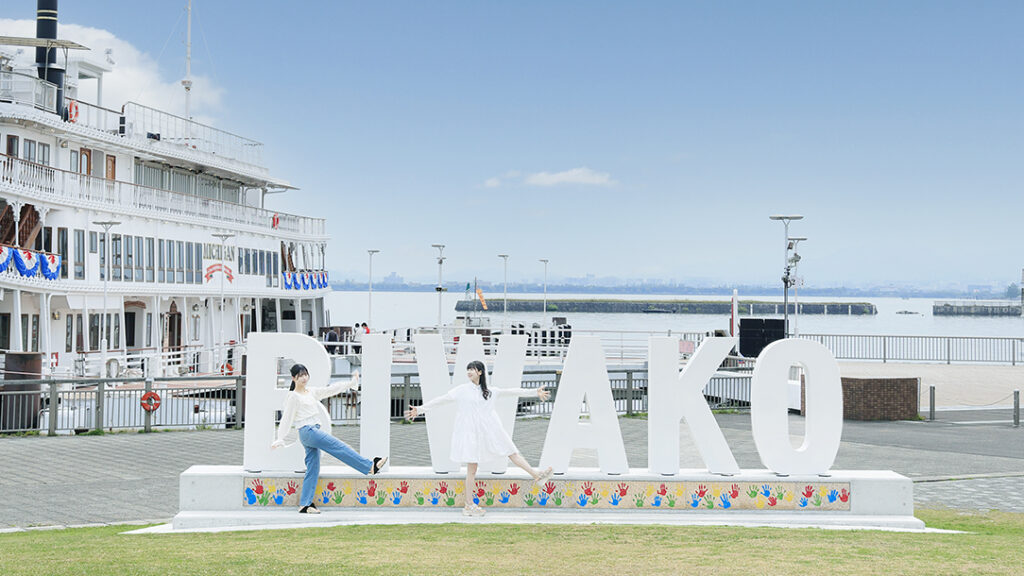 大津港ミシガン乗り場のすぐ隣にある「BIWAKOモニュメント」。2025年3月に大津中央ロータリークラブの創立40周年事業として設置されたこのモニュメントは、高さ約2メートル、幅約8メートルと大きなもの。停泊するミシガンと一緒に記念撮影を!
